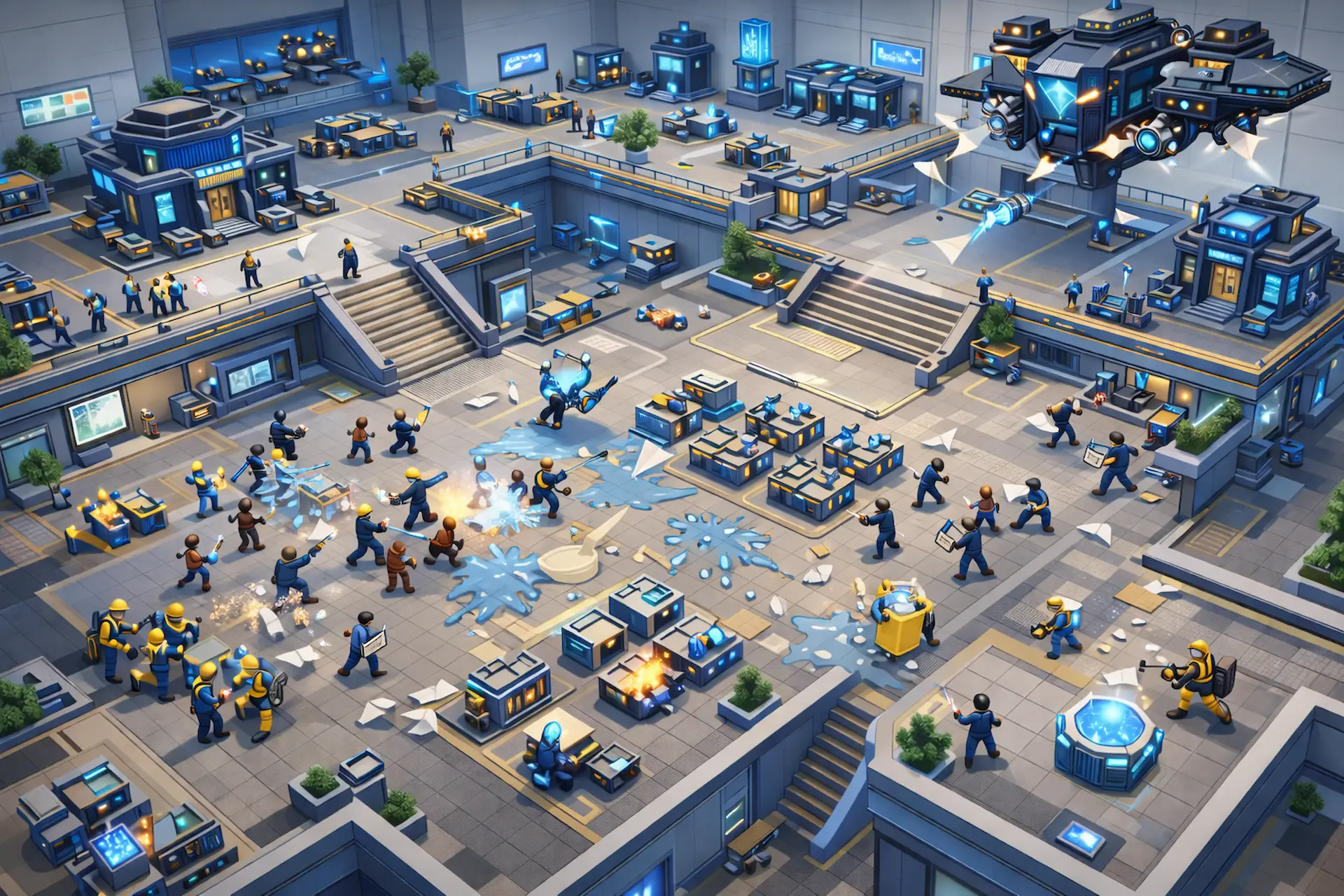 Fast, readable RTS action across desks, cubicles, and workplace choke points.